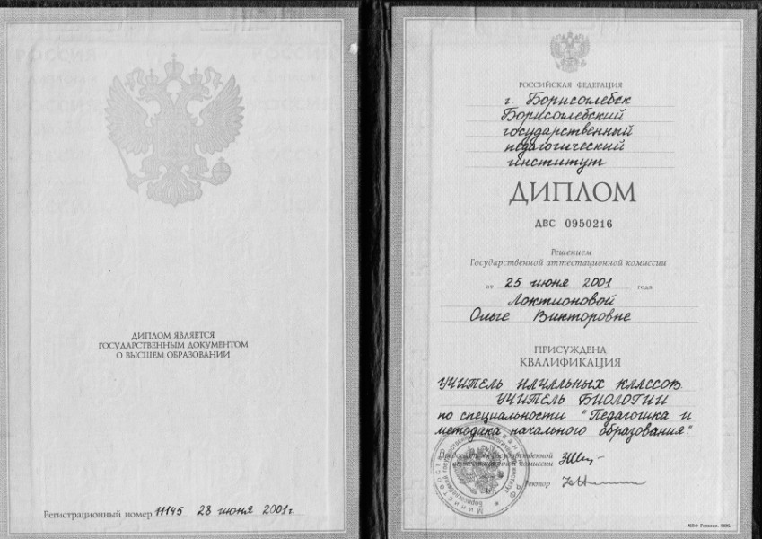 - Образование: Борисоглебский государственный педагогический институт, факультет"Педагогика и методика начального образования", квалификация - учитель начальных классов, год окончания - 2001.