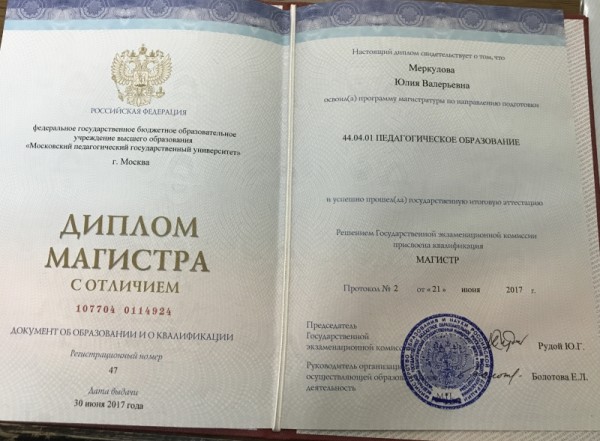 - Образование: Магистратура, педагогического университета имени Ленина (МПГУ).