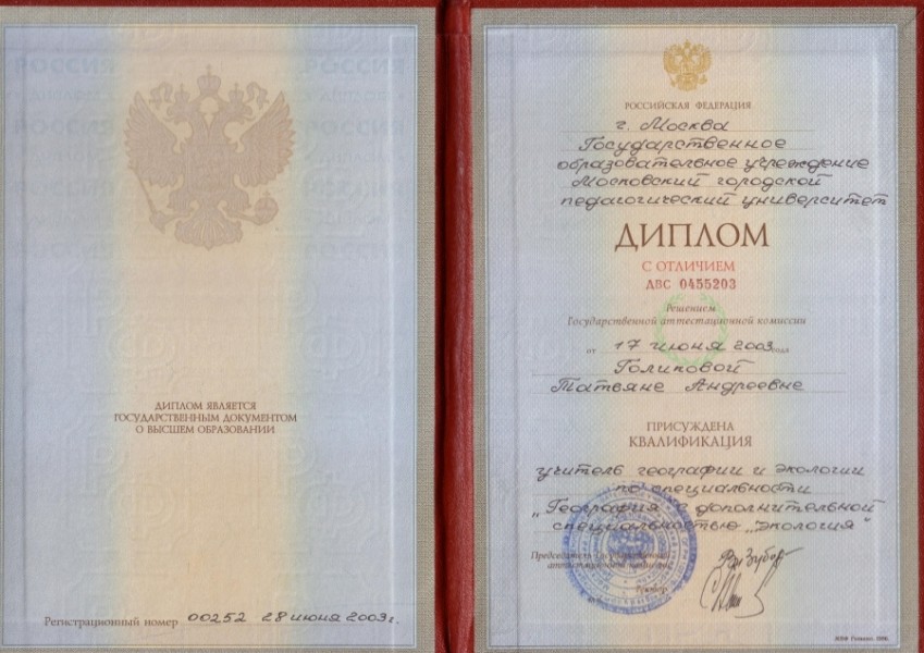 - Образование: МГПУ, географический факультет. Специальность: учитель географии и экологии, 2002 год окончания. МГПУ, факультет дополнительного образования. Кафедра английского языка - "учитель английского языка", 2003 год окончания. Преподаватель английского языка.