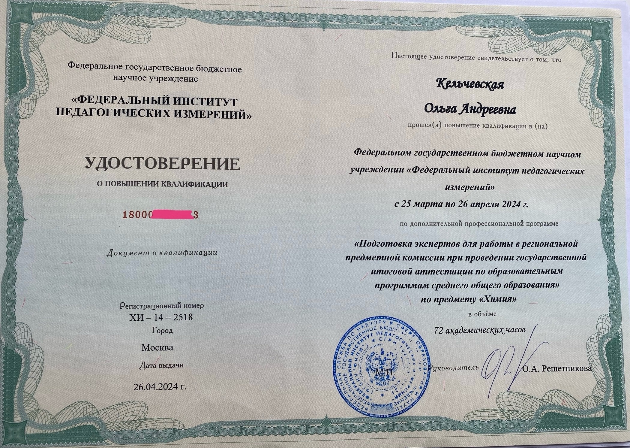 В 2024 прошла курс повышения квалификации по подготовке ЭКСПЕРТОВ региональных комиссий ЕГЭ по химии.