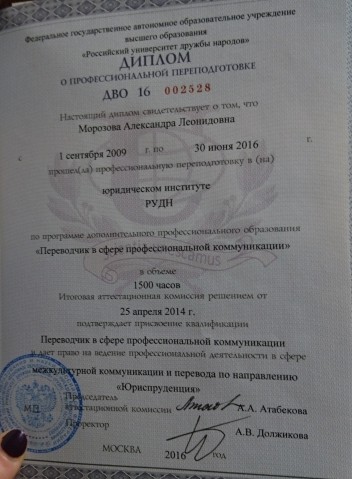 - Образование: Российский университет дружбы народов юридический факультет и дополнительное образование переводчик в сфере проф. коммуникаций.