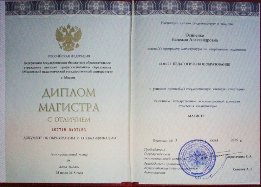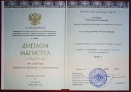 В 2015г. окончила магистратуру МПГУ, красный диплом.