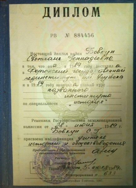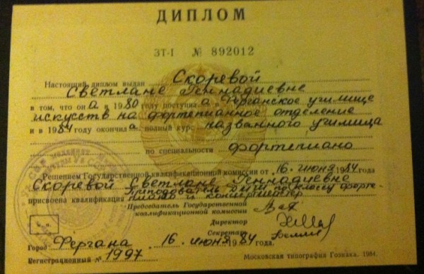 Образование: Ташкентский институт культуры, 1988 г. Специальность - фортепиано.