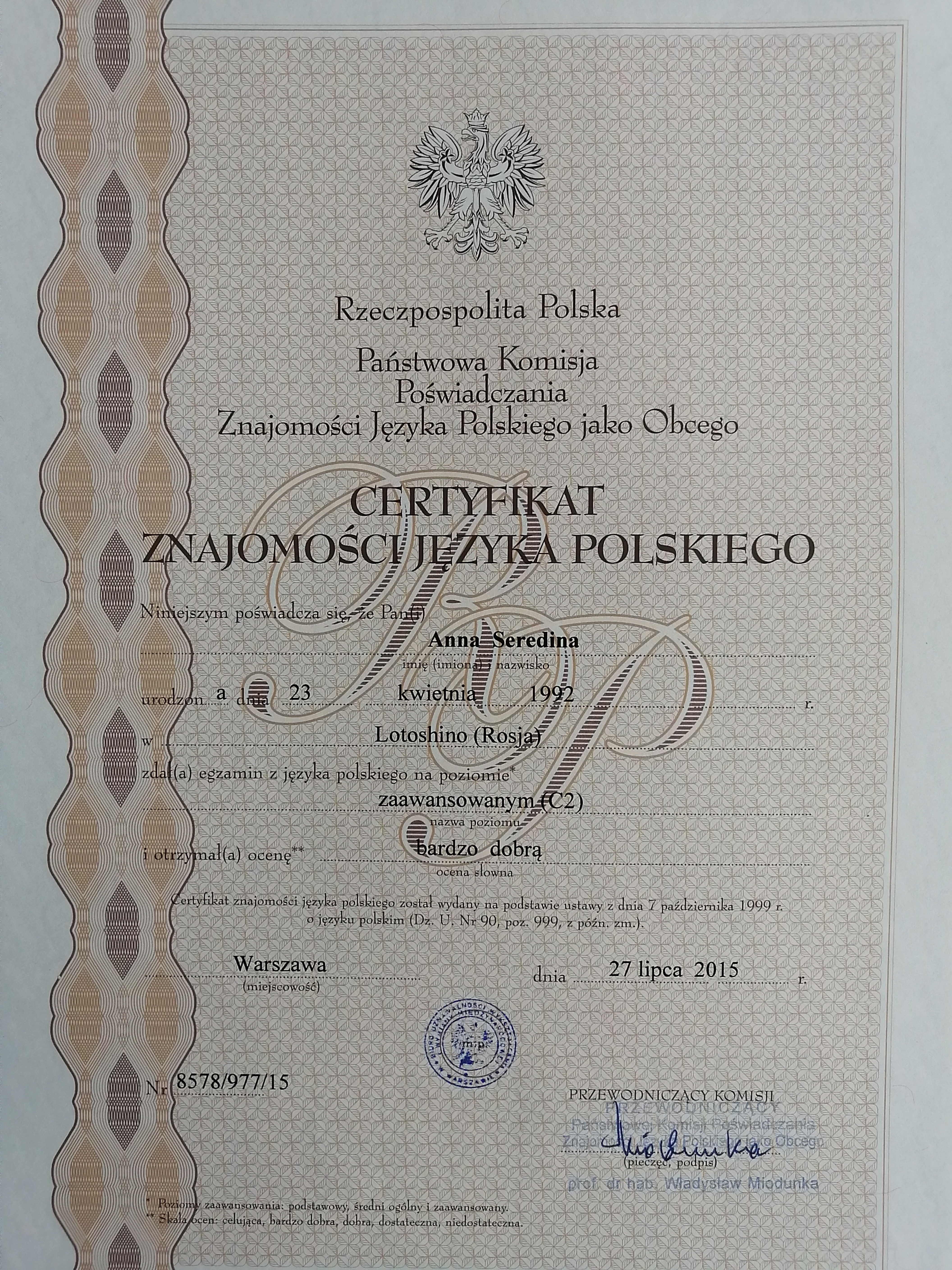 Имею сертификат, подтверждающий знание польского языка на уровне носителя (С2).