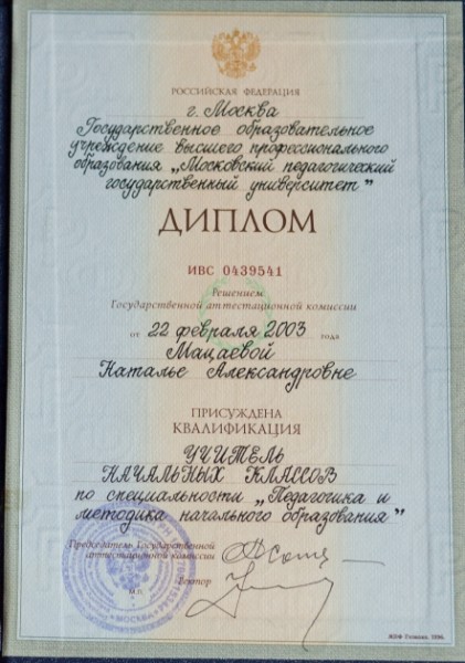 Образование: МГПУ имени Ленина, дата окончания 2003 год, специальность "учитель начальных классов".