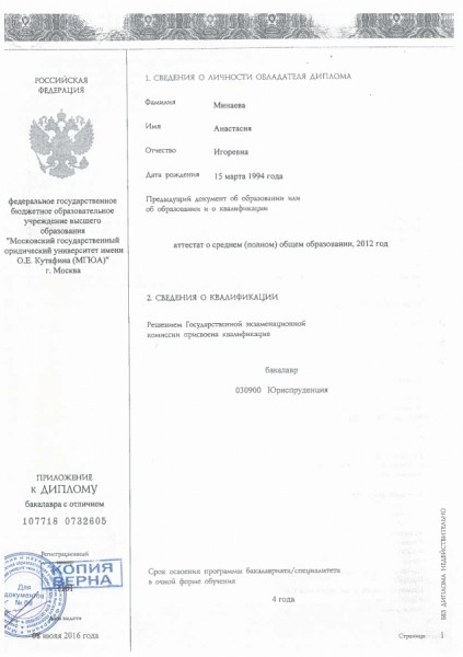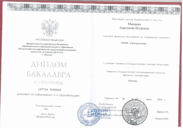 - Образование: Московский Государственный Юридический Университет им. О. Е. Кутафина (МГЮА), выпускник, магистрант.