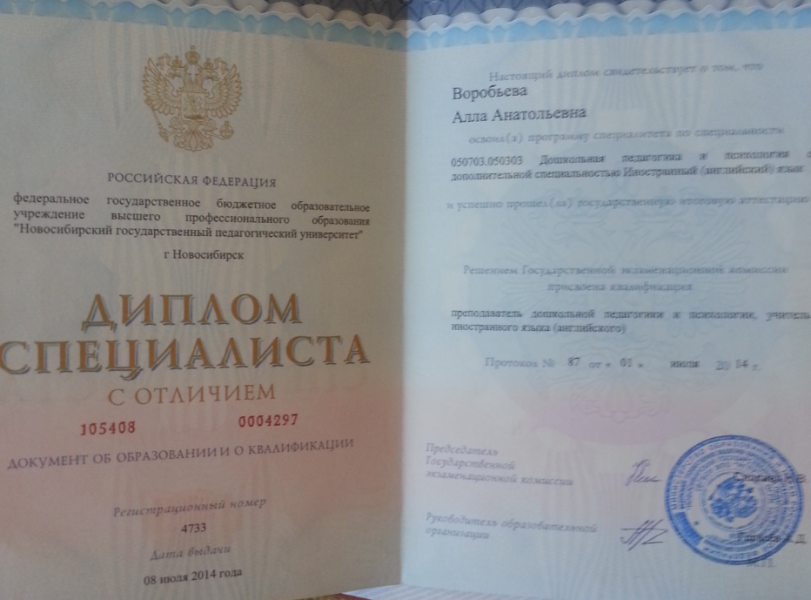 - Образование: Новосибирский Государственный Педагогический Университет, год окончания - 2014. Диплом специалиста с отличием, Специальность - Иностранный (английский) язык.