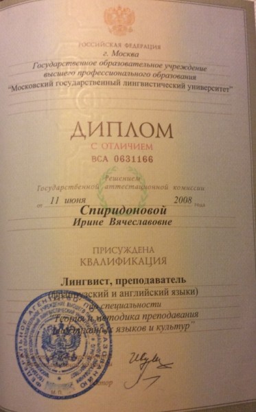 - Образование: Диплом Московский Государственный Лингвистический Университет ( МГЛУ), факультет французского языка (лингвист-преподаватель), год окончания 2008.
