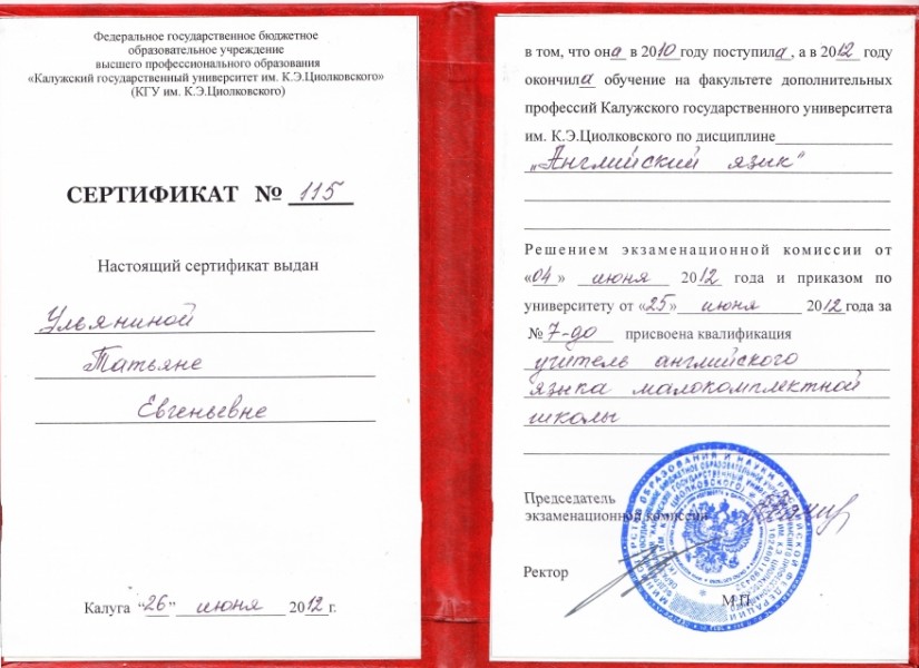 - Образование: Выпускница филологического факультета Калужского государственного университета им. К.Э. Циолковского (диплом с отличием). В 2012 окончила курсы по английскому языку (специальность - учитель английского языка в малокомплектной школе), а в 2014 году - курсы по методике преподавания РКИ.