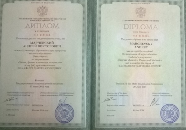 - Образование: МГУ им. М. В. Ломоносова, факультет наук о материалах, диплом бакалавра материаловедения с отличием. На данный момент студент 1 года магистратуры ФНМ МГУ.
