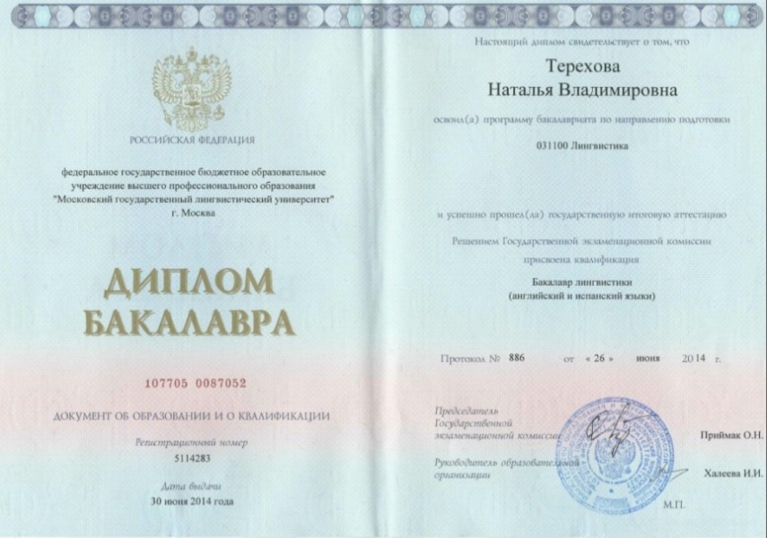 Московский государственный институт международных отношений (Университет) МИД России (МГИМО), квалификация (степень) - магистр педагогики (английский и испанский языки), год окончания - 2017.