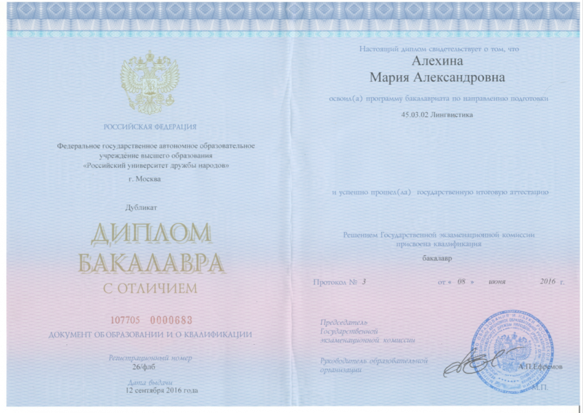 Образование: С отличием закончила РУДН филологический факультет по специальности "лингвистика".