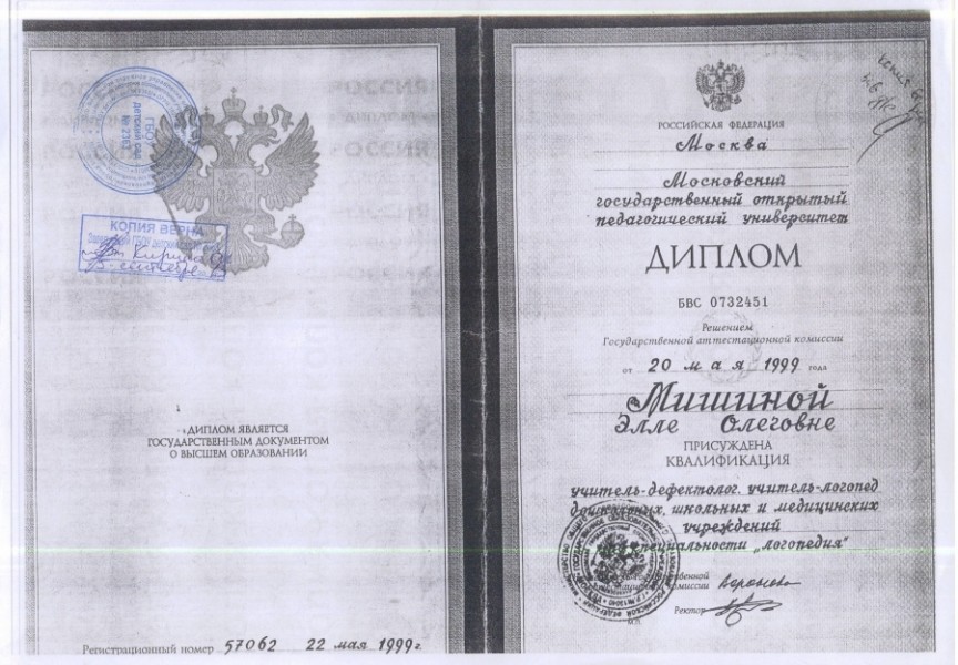 Образование: МГОПУ им. Шолохова (Московский государственный открытый педагогический университет) 1999 г. Присвоена квалификация учитель-логопед, учитель - дефектолог дошкольных, школьных и медицинских учреждений по специальности "логопедия"