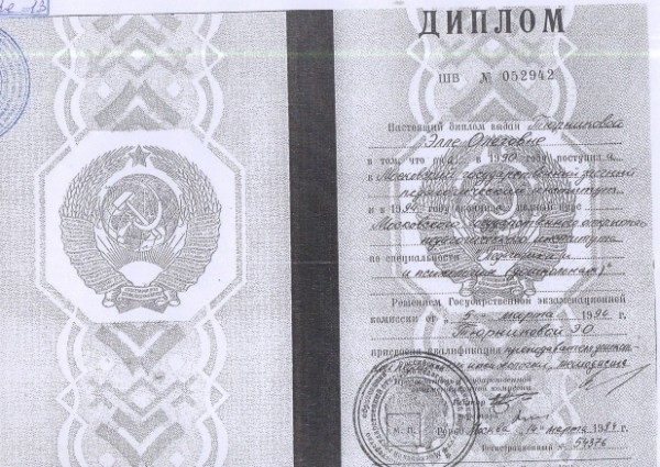 МГЗПИ им. Шолохова, 1994 г. - Присвоена квалификация преподаватель дошкольной педагогики и психологии, методиста по специальности "педагогика и психология дошкольная".