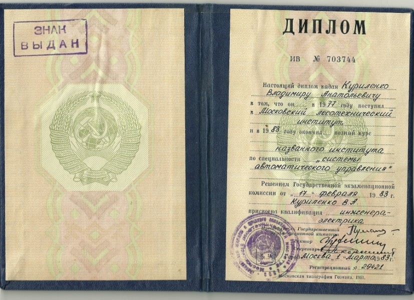 Образование: МЛТИ, факультет электронно-счетной техники (ФЭСТ), 1983г.