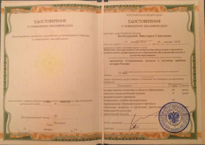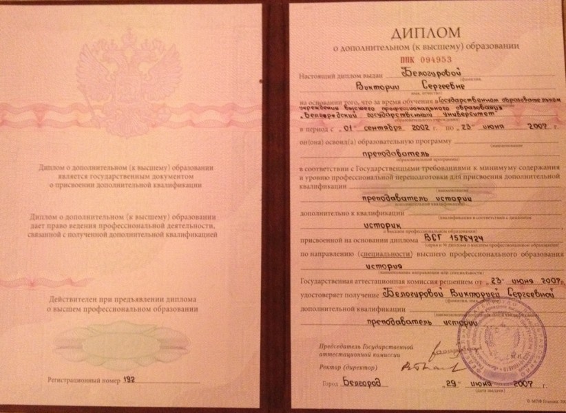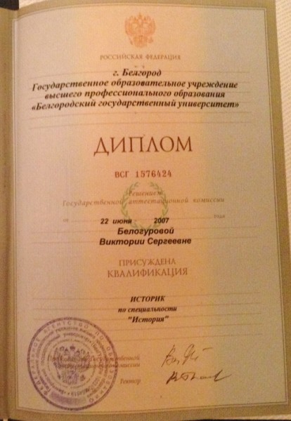 - Образование: Белгородский Государственный Университет, исторический факультет, 2007 г., специалист.