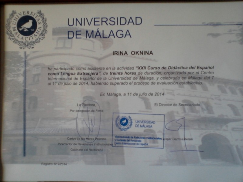 Июль 2014 г. - курсы повышения квалификации учителей испанского языка при Университете г Малага /Испания/.