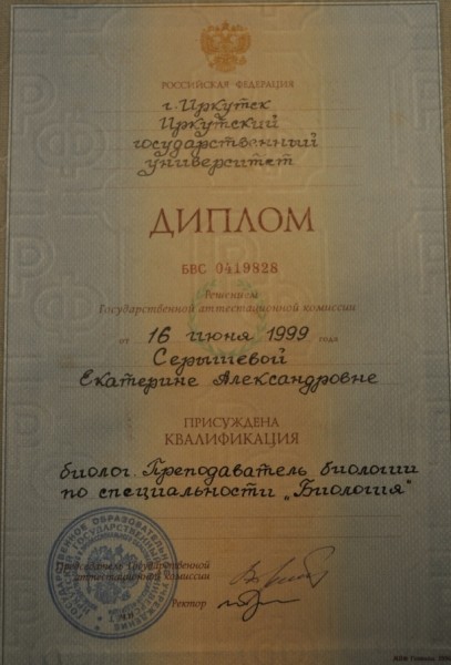 Образование: Иркутский Государственный Университет, биологический факультет, специальность: преподаватель биологии, год окончания: 1999;