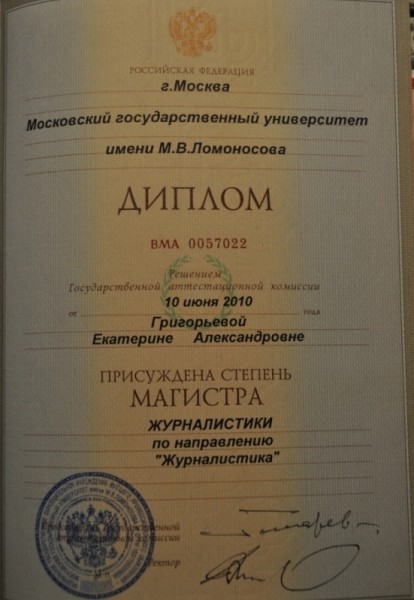 Московский Государственный Университет, факультет журналистики, магистр журналистики, год окончания: 2010.
