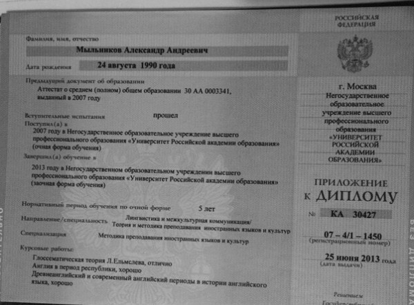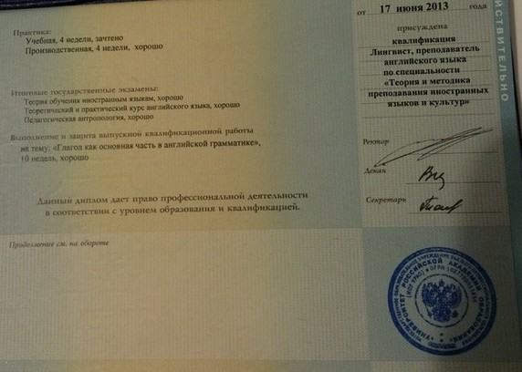 - Образование: Университет Российской Академии Образования, факультет иностранных языков. Год окончания: 2012.