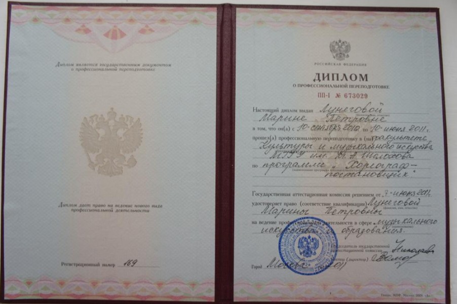 - Образование: МГГ им. М. А. Шолохова, хореограф - постановщик, 2011 год окончания.