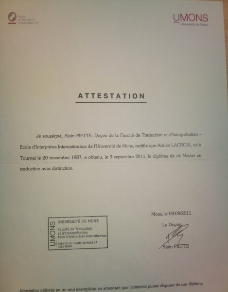 магистратура - Университет Монса, факультет перевода - выпускник 2011 г.;