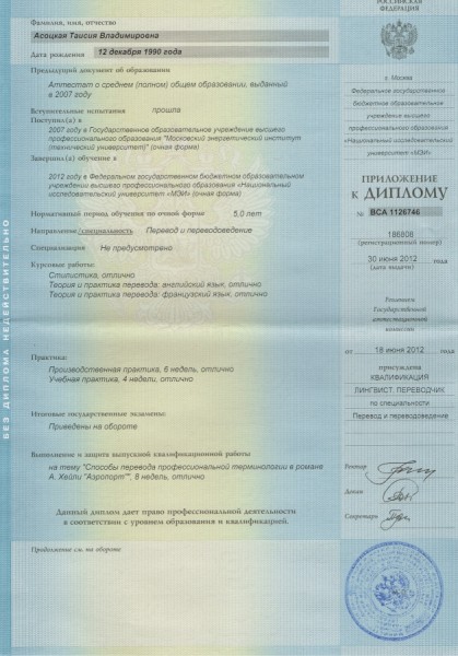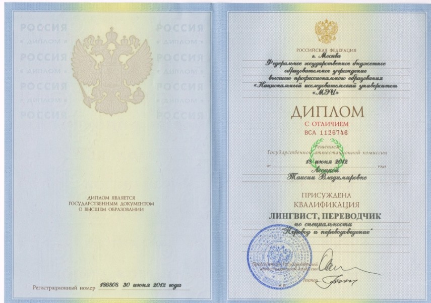 - Образование: МЭИ (ТУ), факультет Перевода и переводоведения, специальность Лингвист-переводчик, год окончания - 2012.