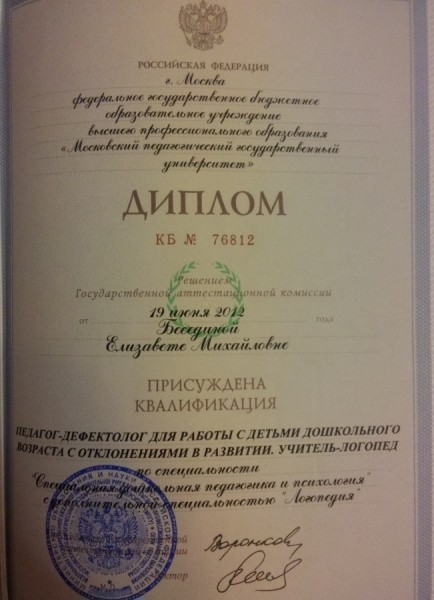 - Образование: МПГУ им. Ленина, дефектологический факультет, дефектолог - логопед.