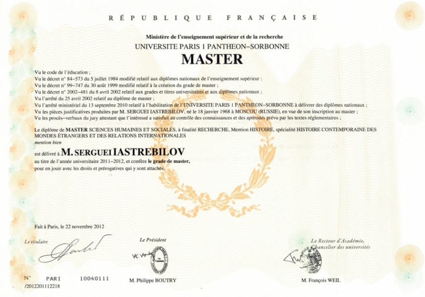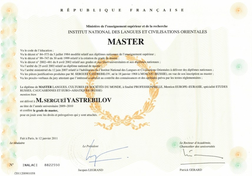 Национальная Институт Восточных цивилизаций, ф-т Изучения Евразии-России. Магистр.