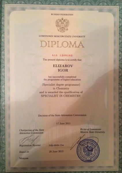 Образование: МГУ им. М. В. Ломоносова, химический факультет, 2013 г.;