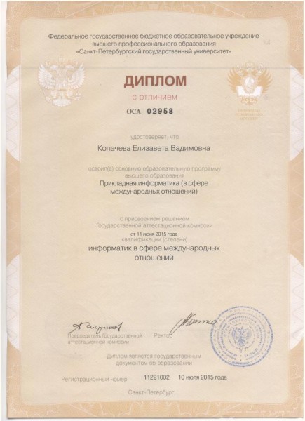 Специальность: специалист в сфере IT и международных отношениях, 2010-2015 гг.
