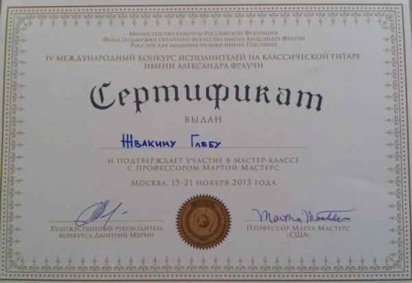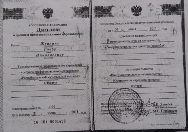 Специальность: классическая гитара-преподаватель, исполнитель. Окончил в 2016 году, красный диплом, бакалавр музыкального искусства.