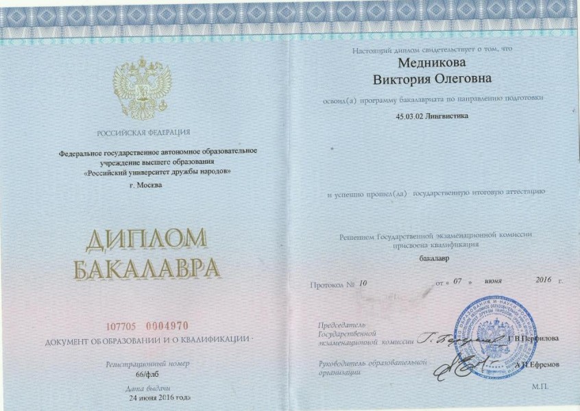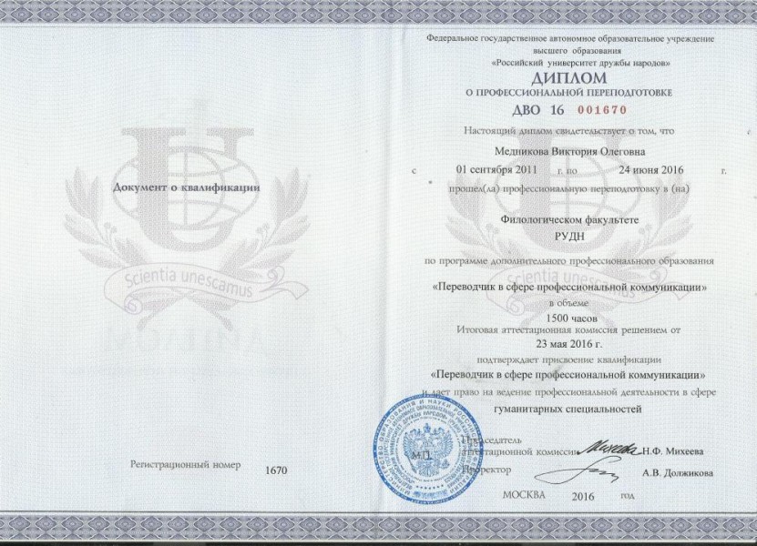 Российсский университет дружбы народов, Институт иностранных языков, специальность - перевод в сфере профессиональной коммуникации, 2016 г.
