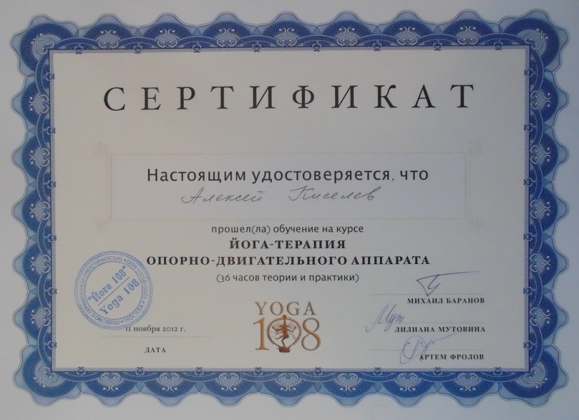Йогатерапия под руководством А. Фролова и С. Агапкина – более 200 часов с написанием и защитой диплома.