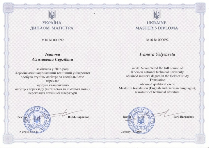 - Образование: Херсонский национальный технический университет, факультет - Филология, специальность - Технический перевод английского и немецкого языка. Магистр.