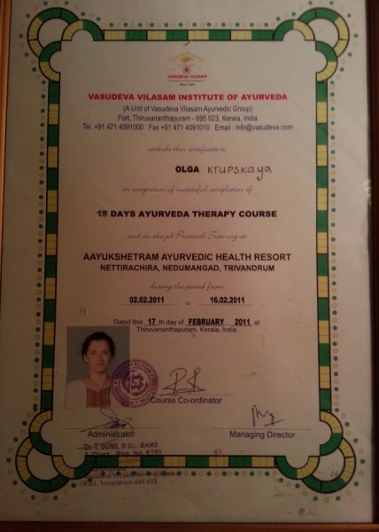 • аюрведе (фитотерапия, диетотерапия) и йоге в Vasudevavilasam university, Индия Тривандрум и в клинике Agastyaashram г. Кочин.