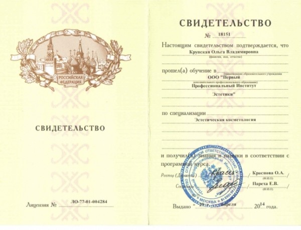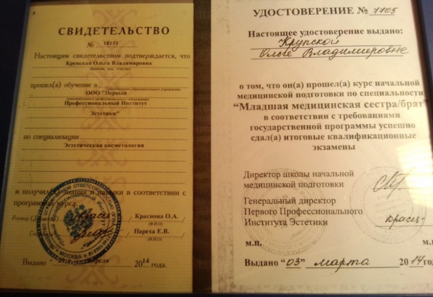 • Первый Профессиональный институт эстетики г. Москва по специальности: “Эстетическая косметология”, ”Младшая медицинская сестра”.