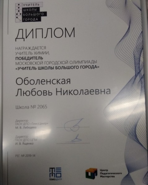 Дополнительная информация: Сейчас совмещаю работу учителем химии в школе №2065 и исполнителем по гранту на кафедре Физики и химии материалов имени Догадкина Б.А. Физико-технологического института МИРЭА - Российского технологического университета. Защищая честь школы, победила в конце 2019 г. в учительской олимпиаде (аналог ВсОШ) "Учитель школы большого города".