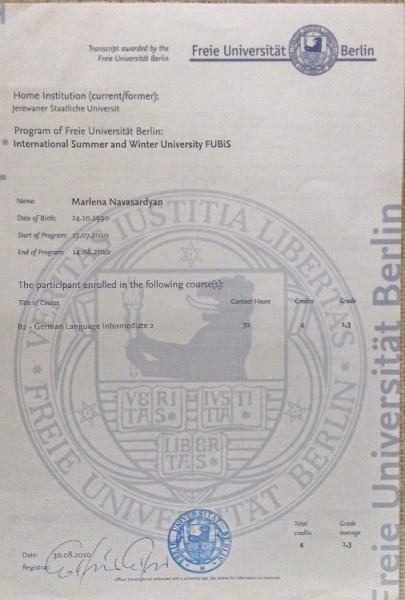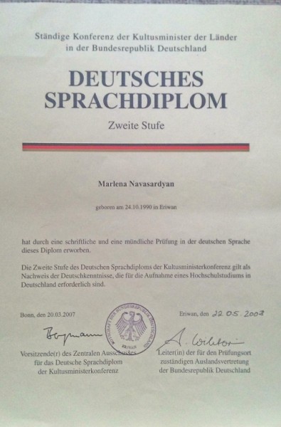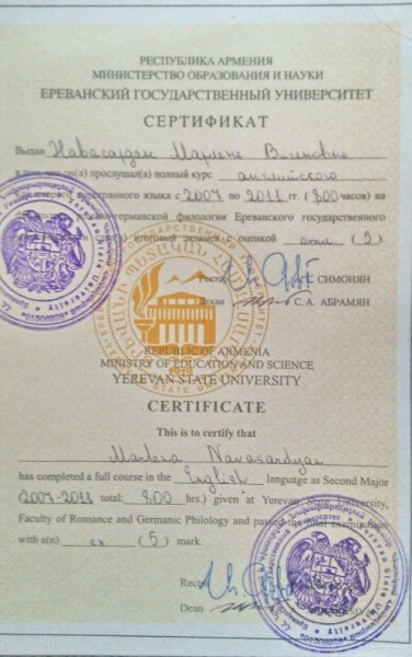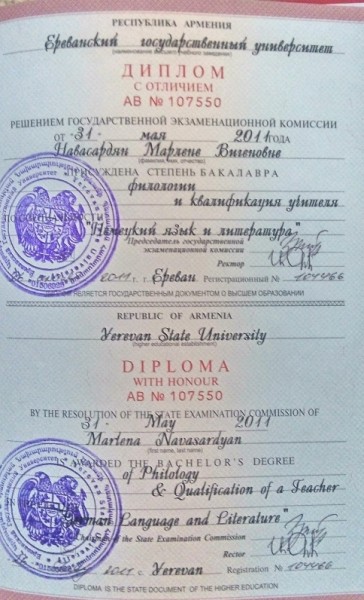 Окончила Ереванский Государственный Университет, факультет Немецкий Язык и Литература. У меня квалификация учителя немецкого языка.2007-2011 .