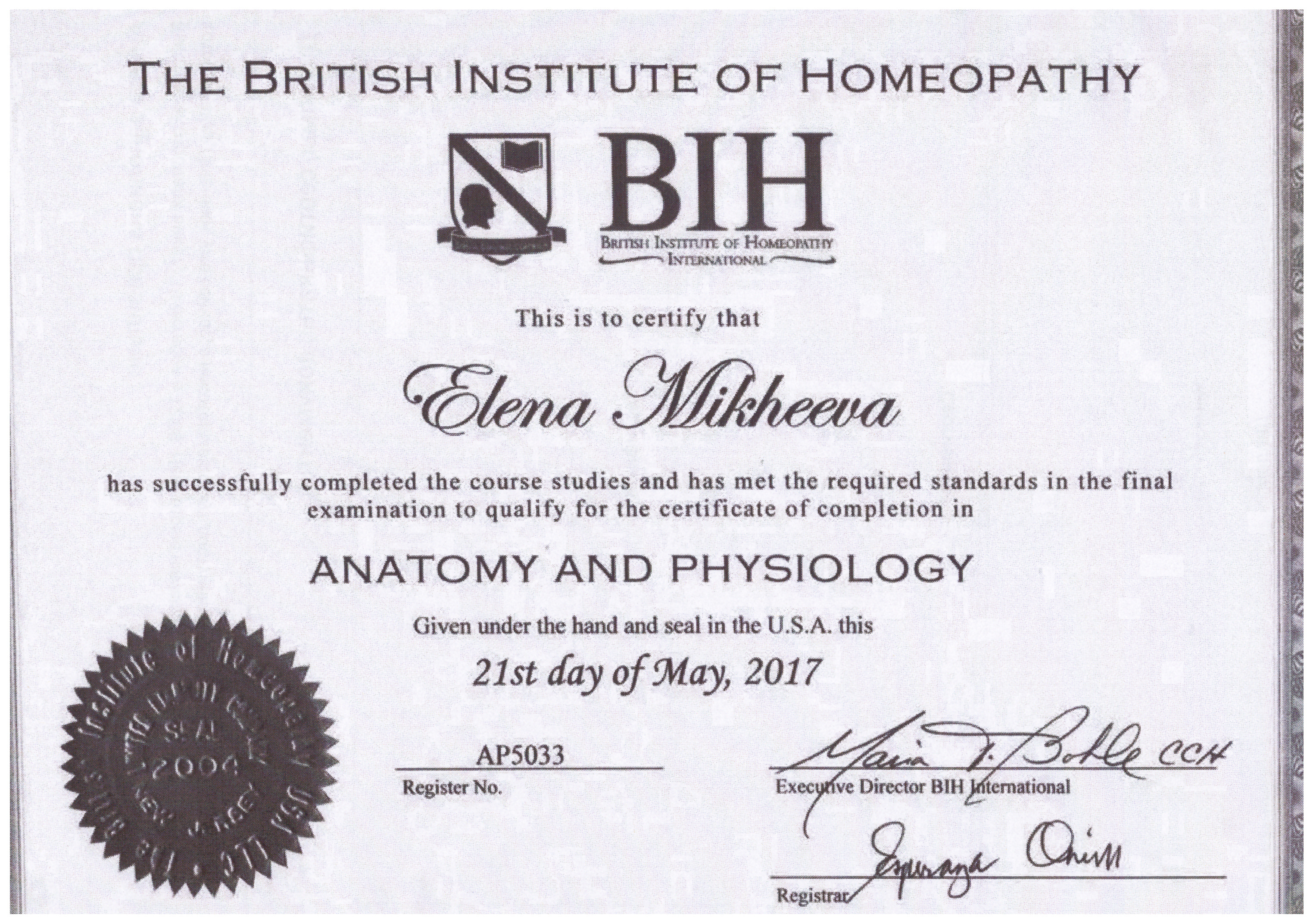 - Образование: Британский институт гомеопатии 2018 г (США), дистанционное обучение