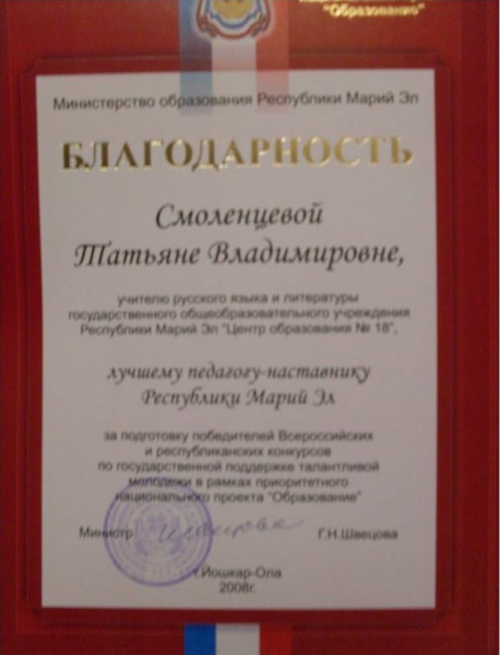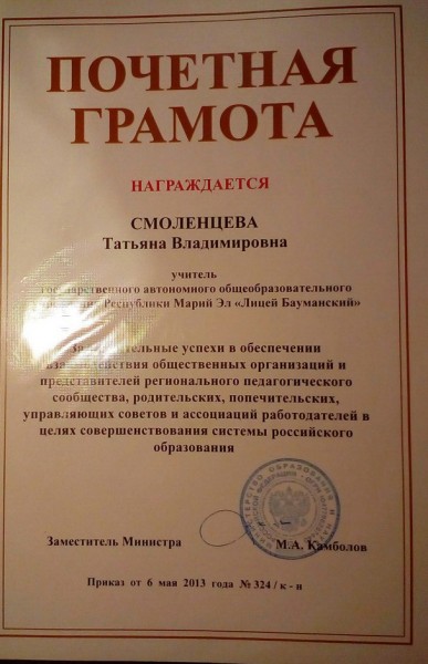 Почетная грамота Министерства образования РМЭ от 3.07. 2006. и другие.