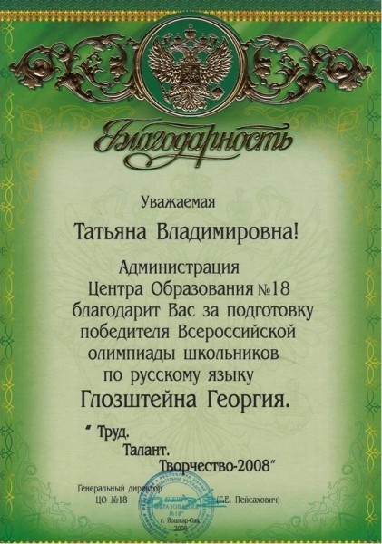 Почетная грамота Министерства образования РМЭ от 3.09.2007.,