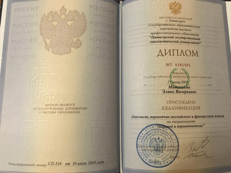 - Образование: Пятигорский Государственный Лингвистический Университет окончила в 2009 году, училась на переводческом факультете.
