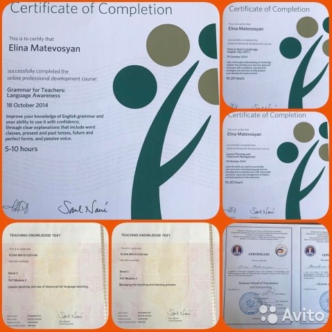 Дополнительная информация: Есть международные Кеммбриджские сертификаты, проходила курсы повышения квалификации в 2012 году "Летняя школа перевода"