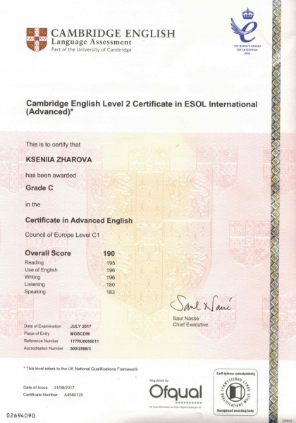 Имею международный сертификат САЕ, подтверждающий владение английским языком на уровне С1 (Advanced). Являюсь призером олимпиад по русскому и английскому языкам, результат ЕГЭ по русскому языку - 98 баллов.