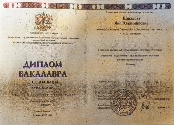 - Образование: Московский государственный лингвистический университет, факультет английского языка, бакалавр лингвистики