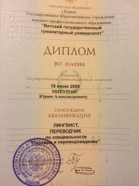 Частным репетитором работал 4 года. Проходил обучение по английскому языку в США, по программе обмена студентами ВятГГУ в 2006 году.