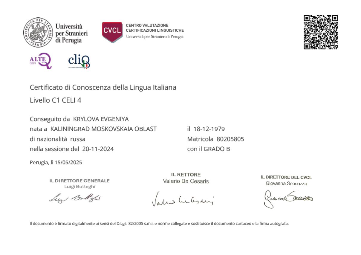 Дополнительная информация: Сертификат CELI C1 2024г.