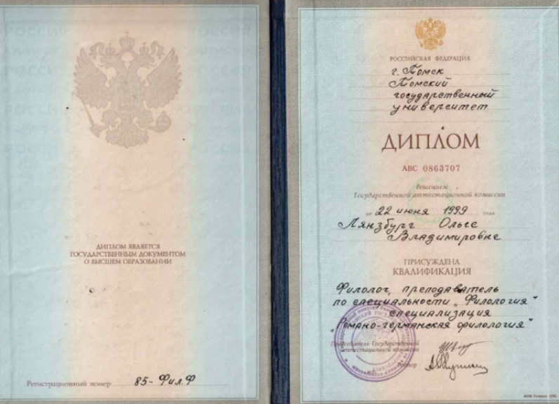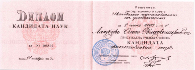 Образование: Томский государственный университет (г.Томск), филологический факультет, специальность: филология, романо-германская филология (год окончания - 1999). Московский государственный университет им.М.В.Ломоносова (МГУ), "Переводчик в сфере профессиональной коммуникации", продолжительность - 2 года (год окончания - 2007). ЦНТИ «Прогресс», г. Санкт-Петербург, курс «Теория и практика перевода» (март 2005 года). Московский педагогический государственный университет им. Ленина (бывш. МГПИ им. Ленина), кандидат филологических наук (2003 год). 04.11.11 - IELTS:7.0; TOEFL paper: 600; TOEFL computer: 250; TOEFL iBT: 100; General Cambridge Exams:CAE;