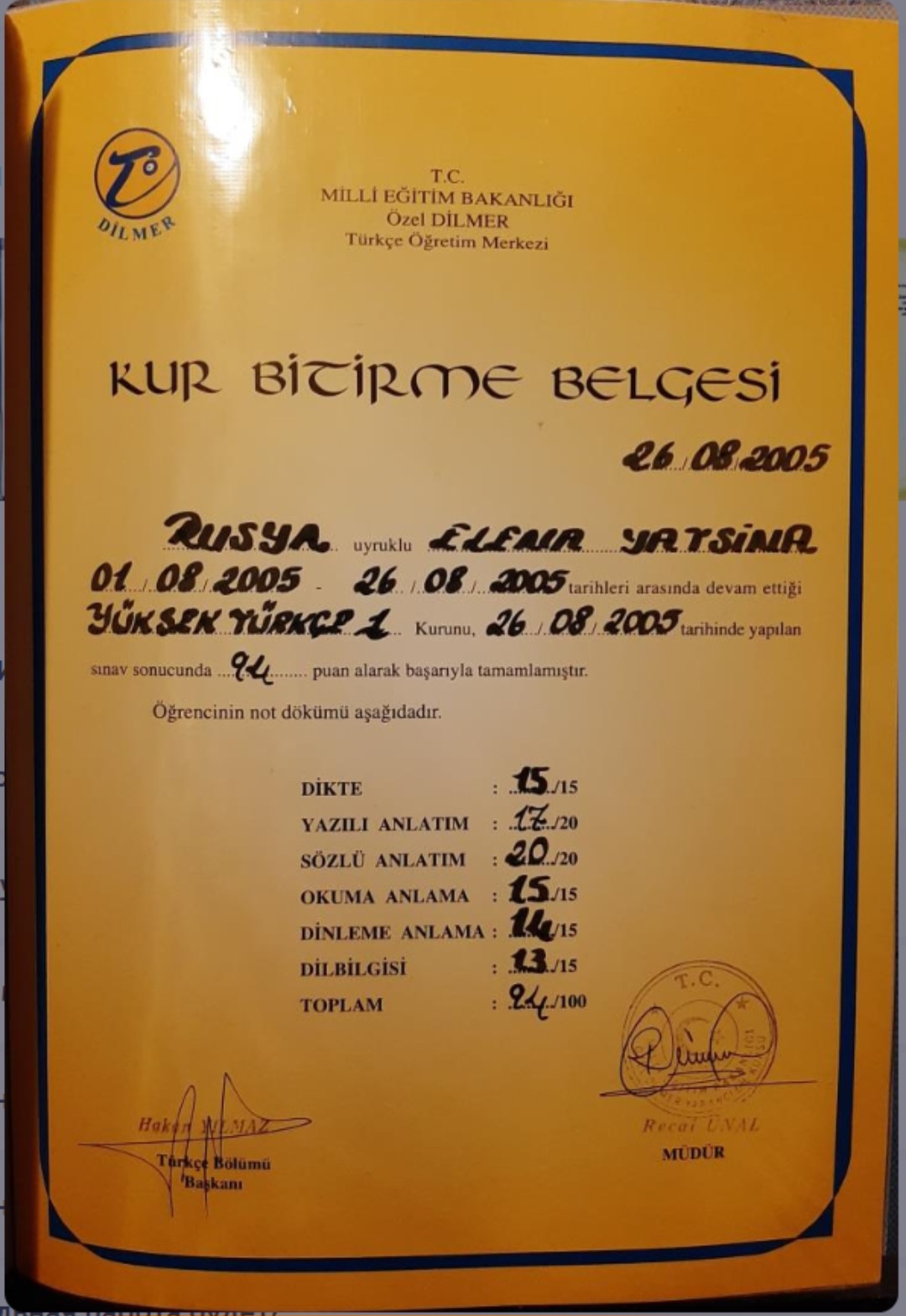 Окончила курсы турецкого языка DILMER (г. Стамбул, Турция, 2005 г.).